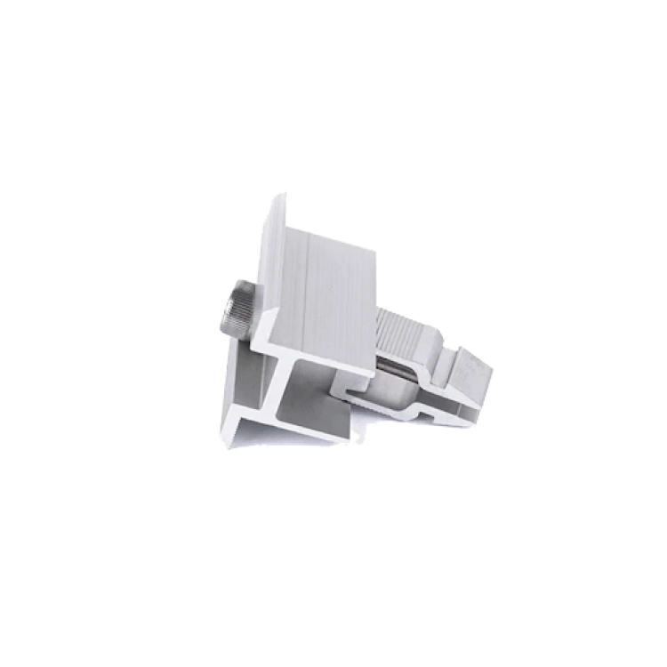 Silver on CLICK center adhesive for mounting photovoltaic panels. Click clamps are used to speed up the installation of photovoltaic systems, as they eliminate the need to insert the nut from the beginning of the mounting rails. The glue set includes a glue, a clip, an allen screw and a square nut. The clamp is dedicated to the profile for the hex bolt.